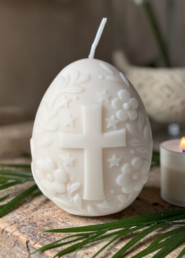 Naturalna, symboliczna świeca chrześcijańska z motywem modlącego się Jezusa. Odlewana ręcznie z wosku sojowego.